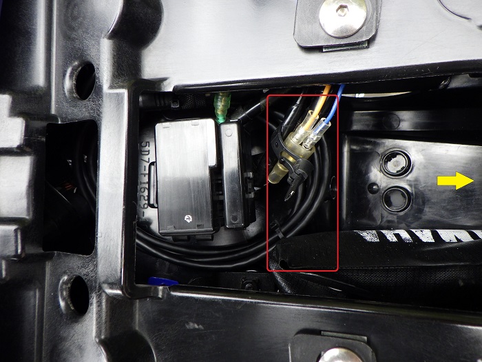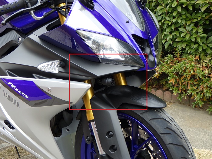 It’s installed under the rear side cowl, so there’s no risk of bumping it when mounting a seat bag or getting on the bike.