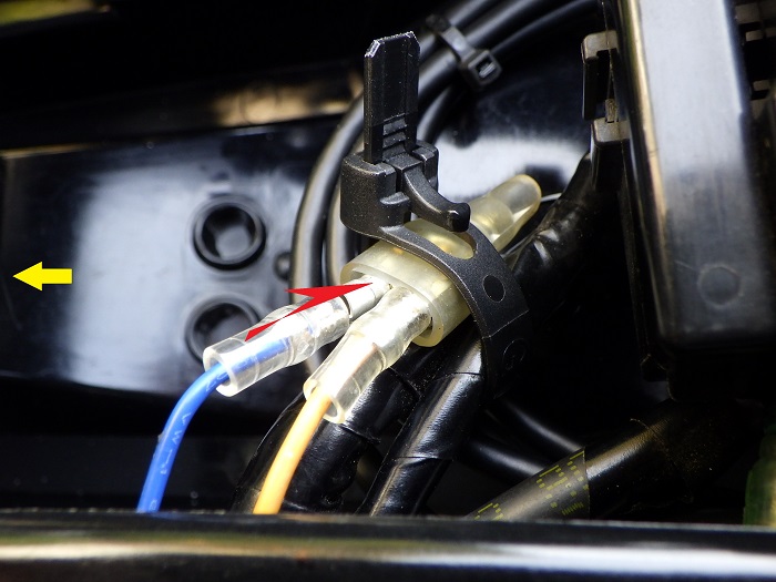 Next, connect the bullet terminal of the blue power wire to the ignition power line.